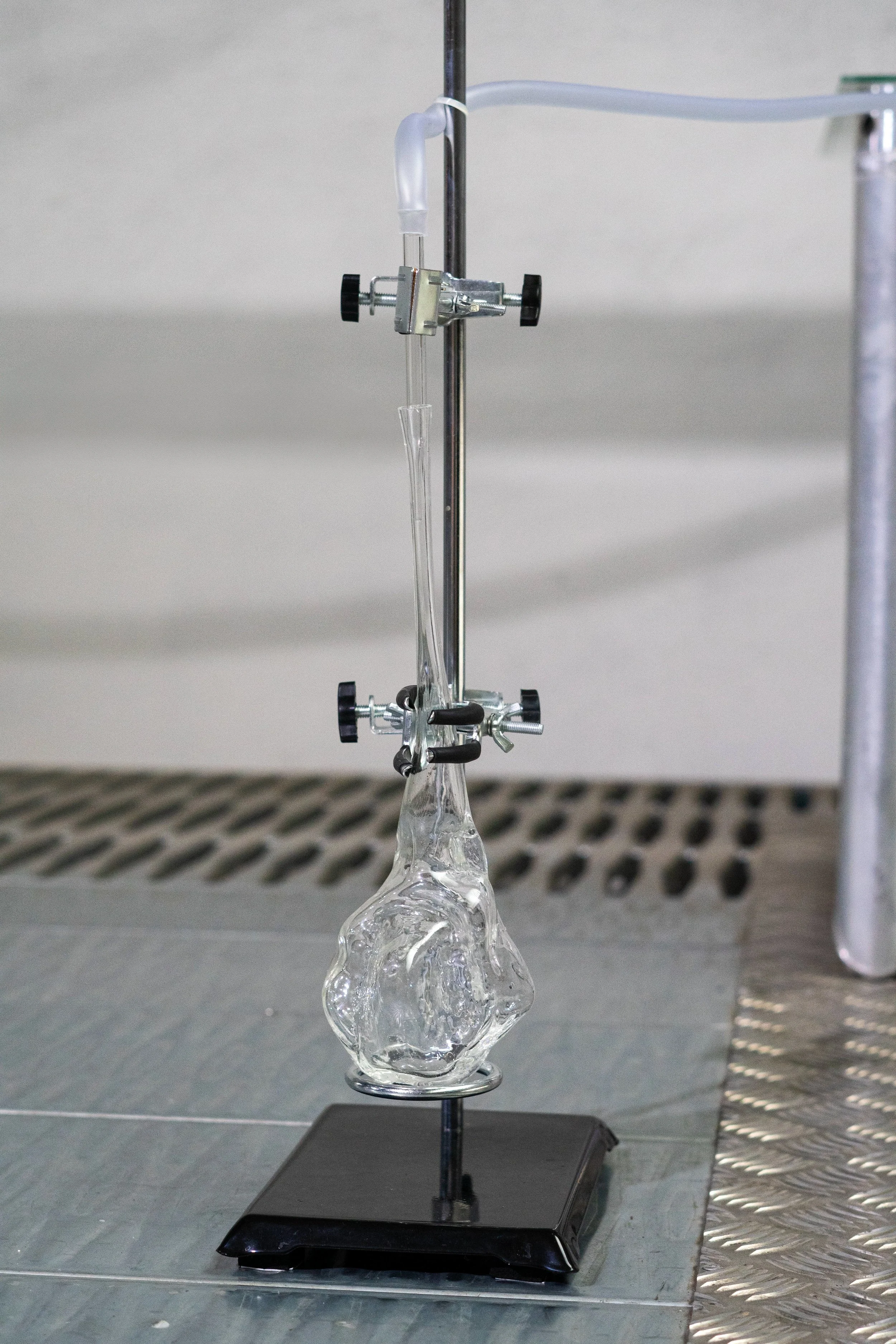 Constructed as an on-site distillation device, it processes the air in the space to condense its atmosphere into a hydrosol-based liquid, funneling the liquid into handblown glass vessels formed to the inside of each artists’ mouth.
