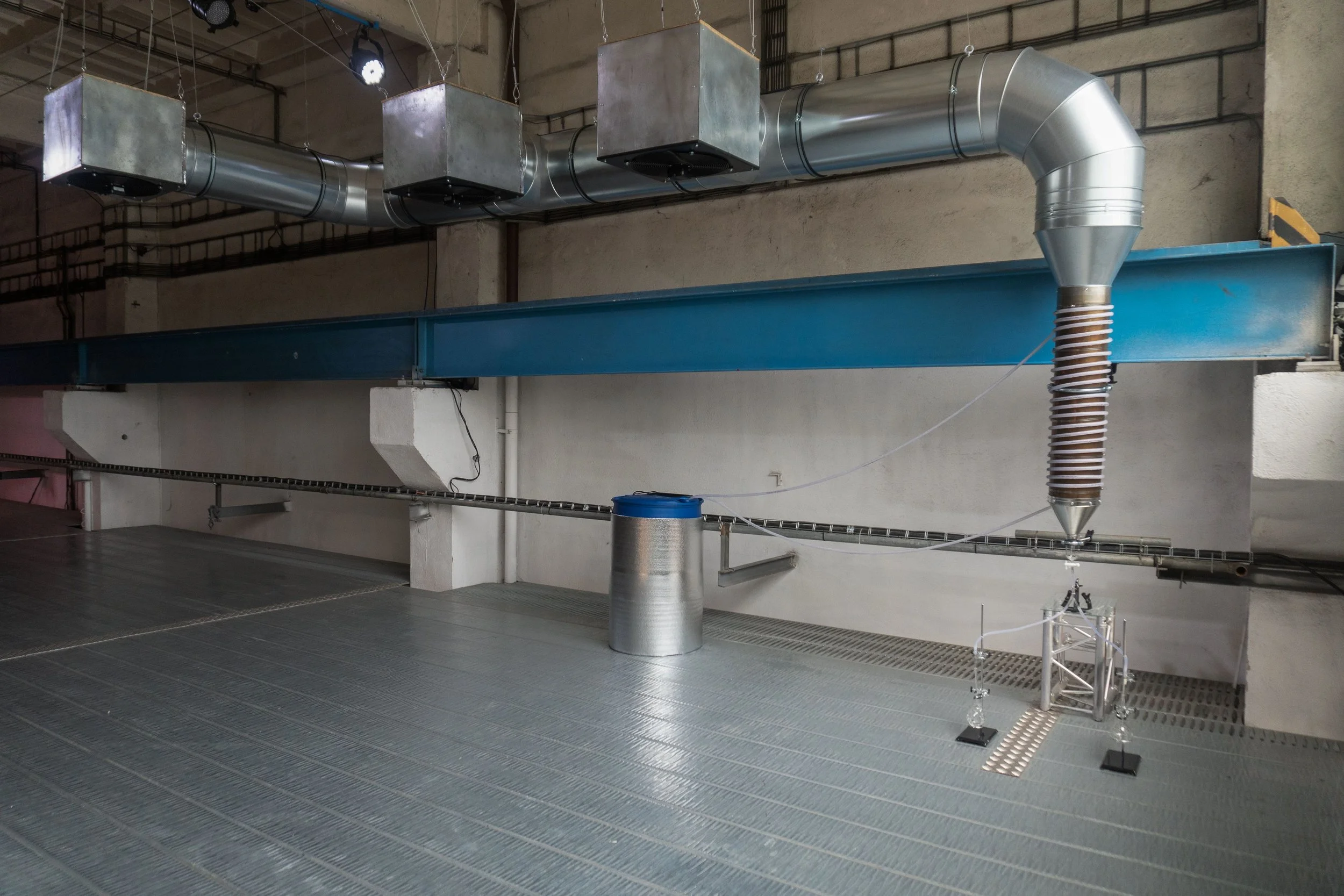 The liquid carries the accumulated scent of the space over the course of the exhibition. The machine is a performer, generating a fluid-based documentation; a collection of breath, sweat, humidity, amongst other indeterminate residues.